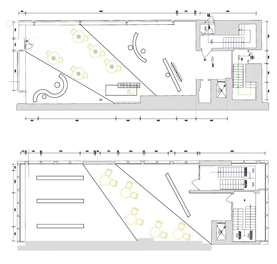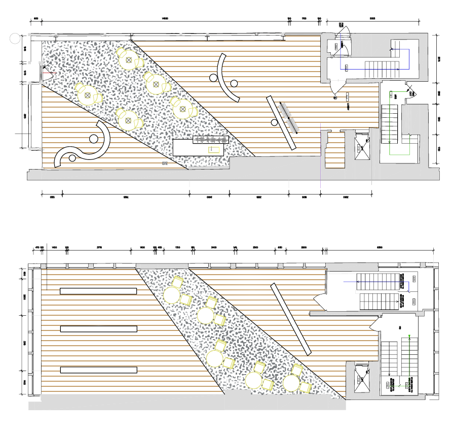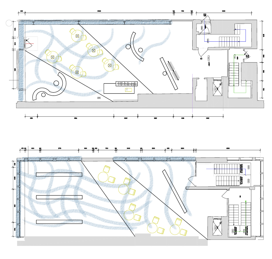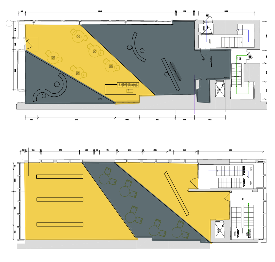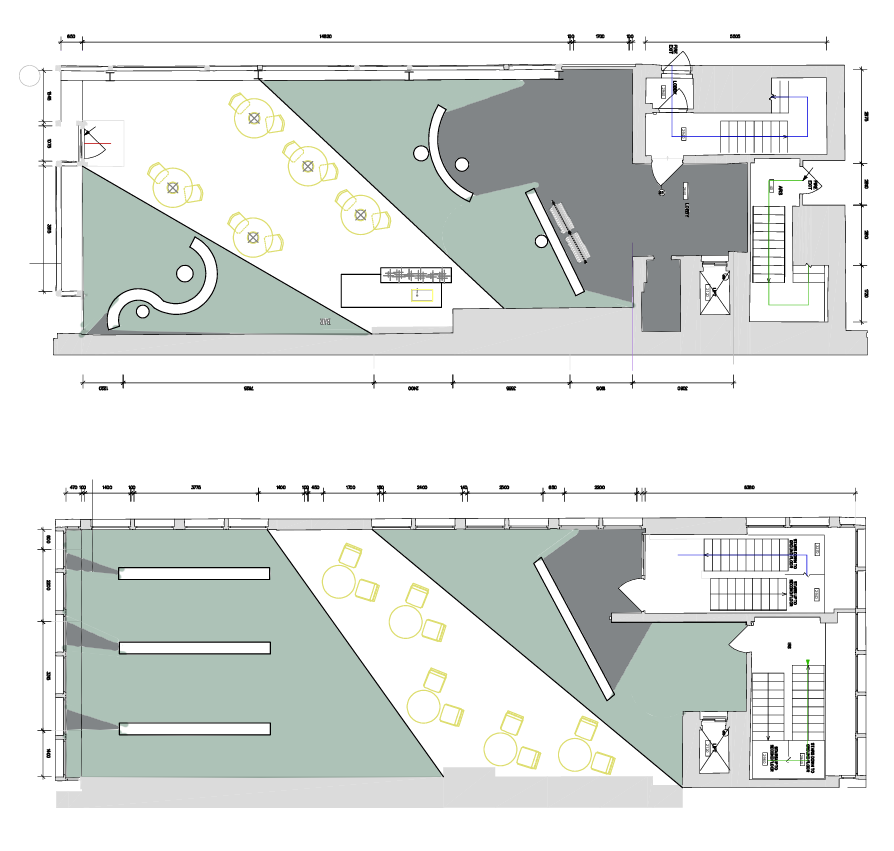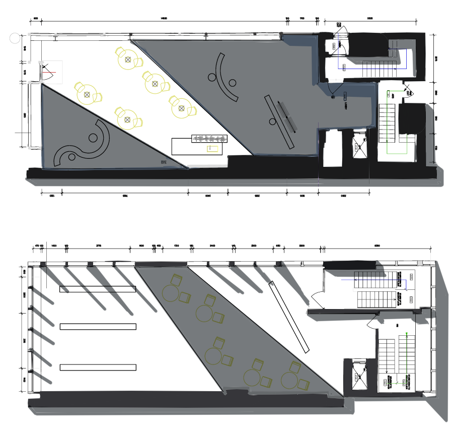 The design of the floor plan was inspired by the shadows cast inside the building by sunlight. The shadows divide the space into two halves—light and dark. Based on this interplay of light and shadow, I developed the interior zoning and the overall tone of the design.
