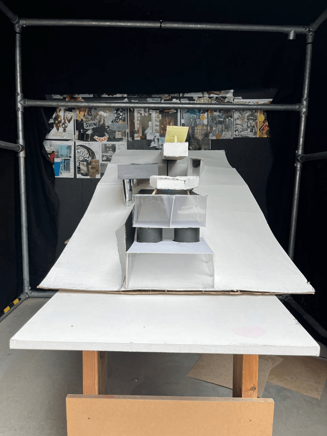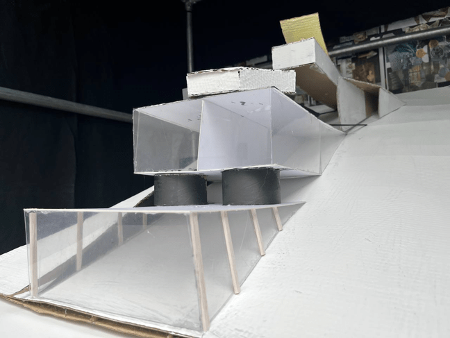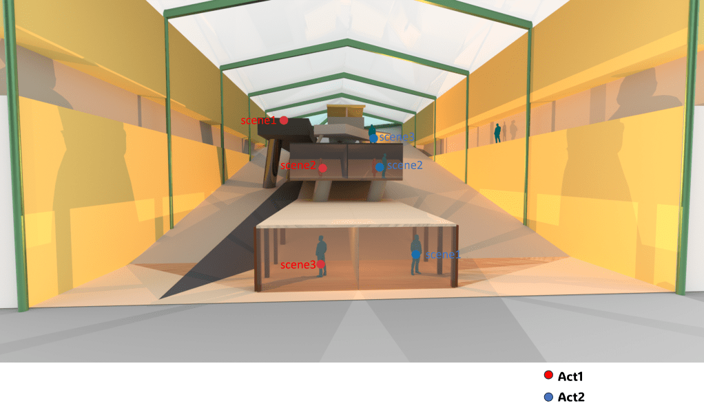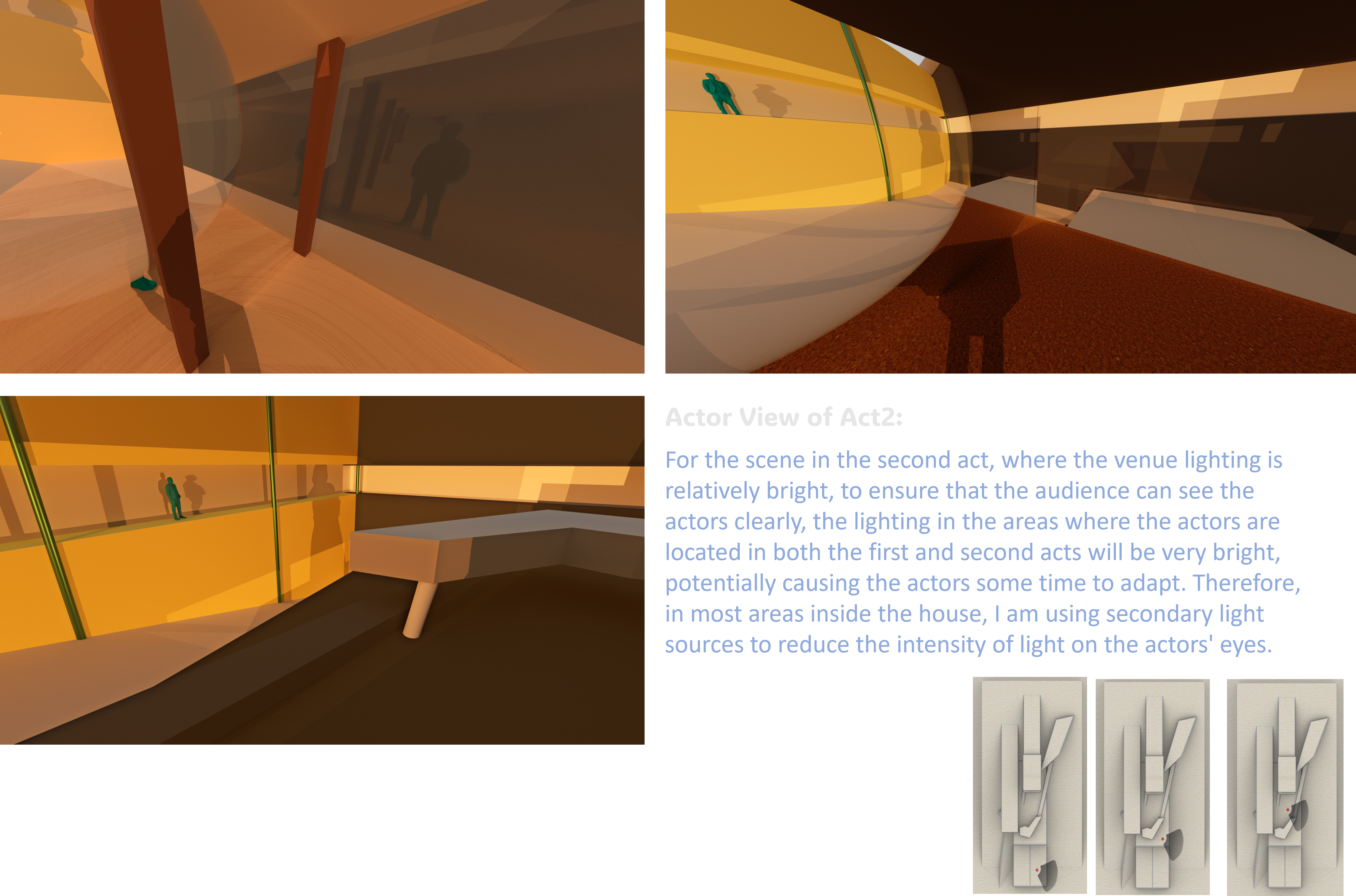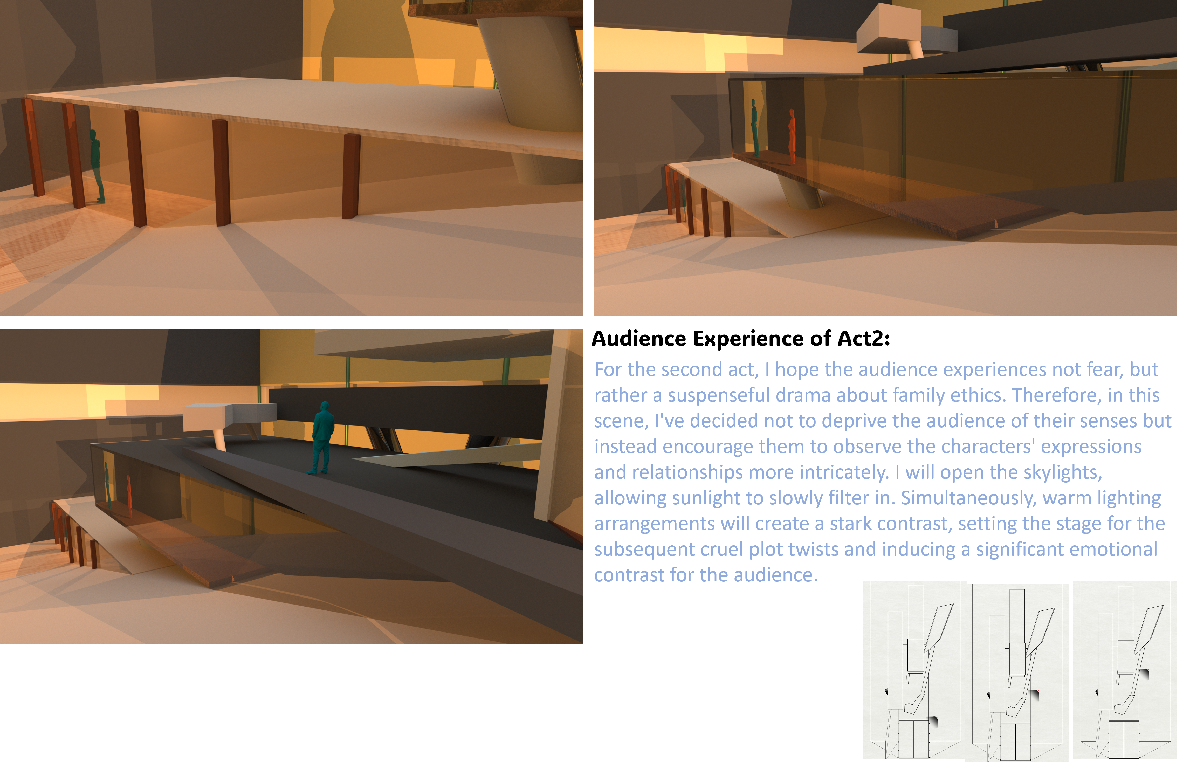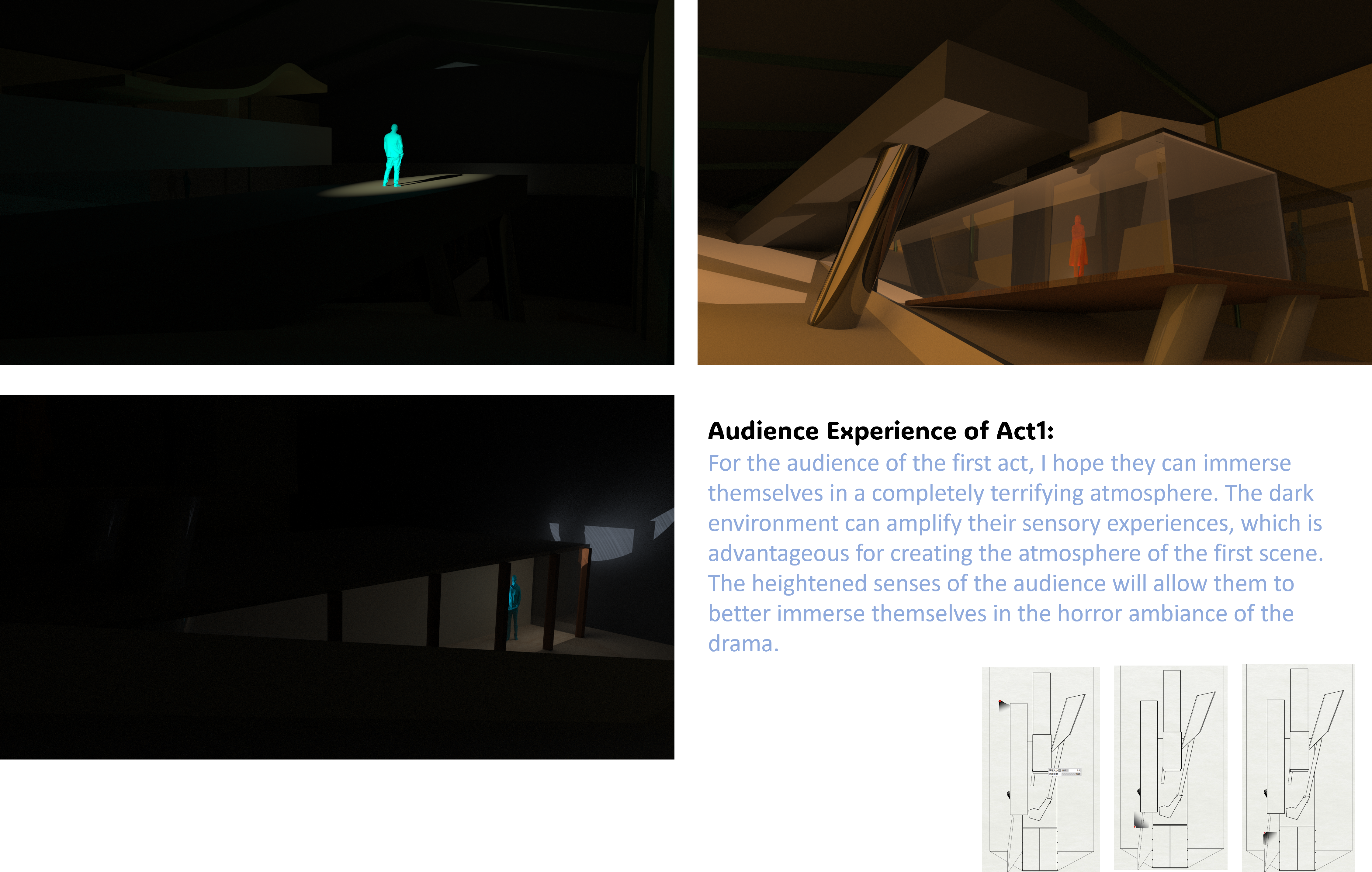 For this stage design, I aim to create something different from the usual. Why should the audience always be sitting still? Is it possible to get them involved? Thus, this stage design was born. I hope the audience can fully immerse themselves in the drama they are watching, using various stage effects such as smoke and water droplets to make them feel like they are stepping into the world of the play. The audience can follow the actors, truly becoming a part of the drama, not just actors. The entire stage is tailor-made for my script, with expansive walking spaces that allow the audience to freely explore, stand, and move around. The angled design creates a sense of the unknown about gravity, prompting the audience to pay more attention to their senses, enabling them to fully engage in the theatrical experience. As sensations gradually amplify, changes in lighting, atmosphere, and smoke will further stimulate the audience to immerse themselves in the roles within the play.