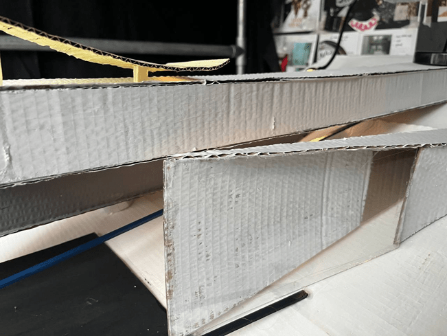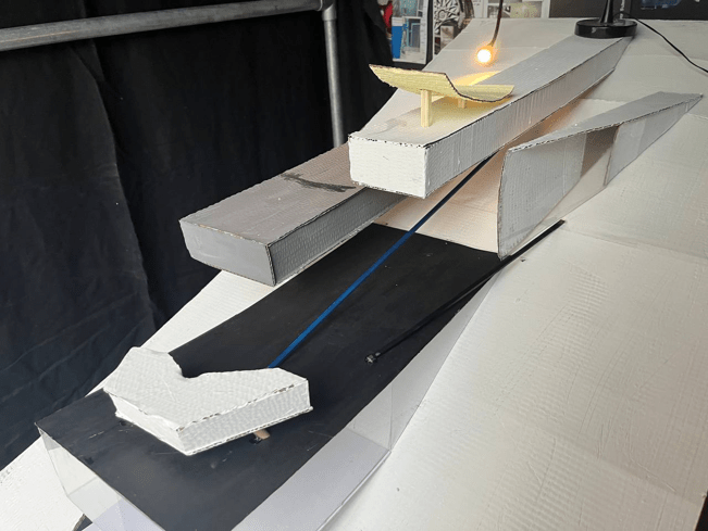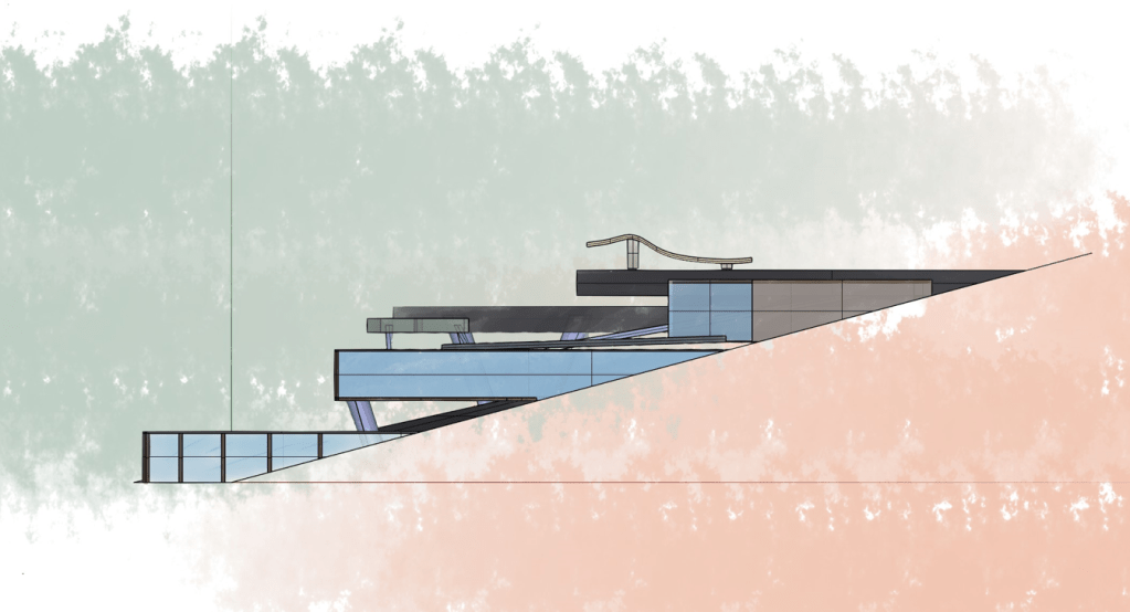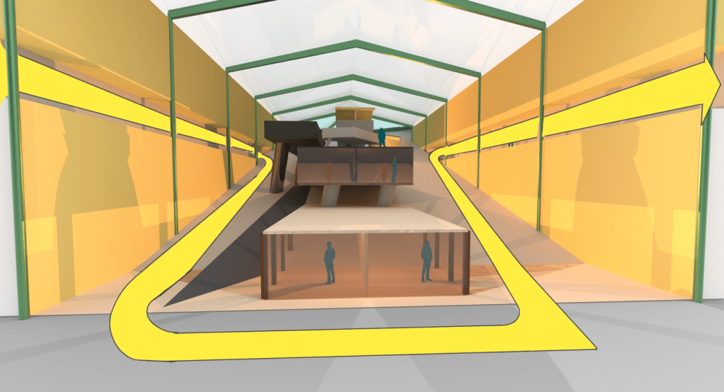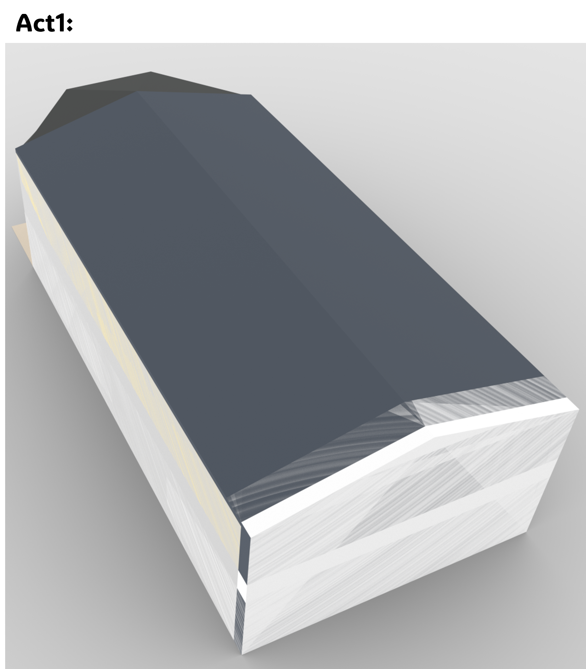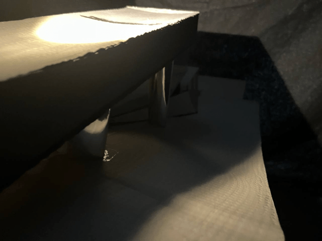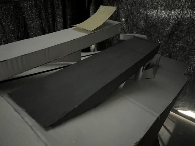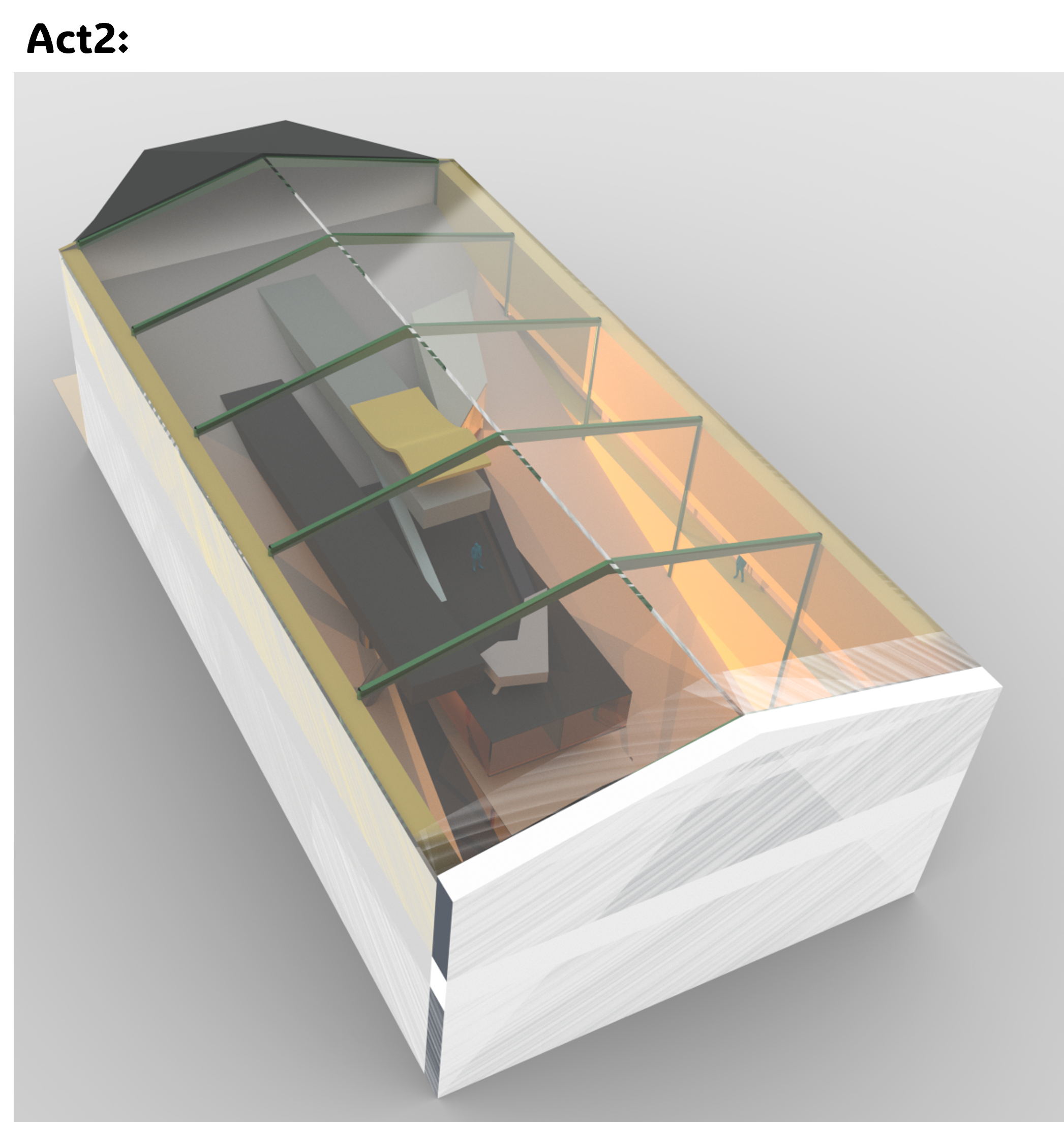 For this stage design, I aim to create something different from the usual. Why should the audience always be sitting still? Is it possible to get them involved? Thus, this stage design was born. I hope the audience can fully immerse themselves in the drama they are watching, using various stage effects such as smoke and water droplets to make them feel like they are stepping into the world of the play. The audience can follow the actors, truly becoming a part of the drama, not just actors. The entire stage is tailor-made for my script, with expansive walking spaces that allow the audience to freely explore, stand, and move around. The angled design creates a sense of the unknown about gravity, prompting the audience to pay more attention to their senses, enabling them to fully engage in the theatrical experience. As sensations gradually amplify, changes in lighting, atmosphere, and smoke will further stimulate the audience to immerse themselves in the roles within the play.