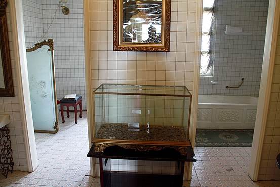As illustrated in Figure 1, this photograph depicts the toilet used by Puyi, the last emperor of China, after his departure from the Forbidden City and subsequent relocation to Shenyang, where the Japanese provided him with a residence. In this image, numerous design features reveal the incorporation of Western stylistic elements, such as the picture frame on the wall, the framing of the mirror on the left, and the decorative carvings surrounding the bathtub.