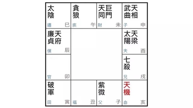 In addition, there are supporting stars such as: Lucun (Wealth Storage), Tianma (Heavenly Horse), Tianku (Heavenly Cry), Tianxu (Void), Hongluan (Red Luan), Tianxi (Heavenly Happiness), Tianxing (Punishment), Tianyao (Flirtation), Xianchi (Peach Blossom), Huagai (Canopy), Guchen (Solitary), and Guasu (Widowhood), among others.